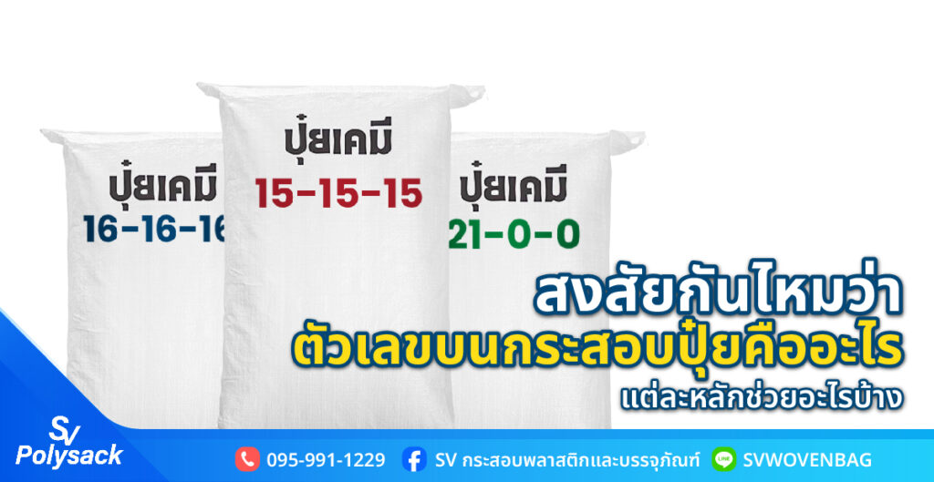 สรุปคือ การรู้ตัวเลขหรือสูตรปุ๋ยต่างๆ บนกระสอบปุ๋ย ไม่เพียงแต่จะช่วยให้เลือกใช้ปุ๋ยที่เหมาะสมกับพืชและสภาพดิน แต่ยังช่วยเพิ่มประสิทธิภาพในการผลิตพืชผลของเรา ทำให้สามารถบริหารจัดการการใช้ปุ๋ยได้อย่างคุ้มค่าและมีผลผลิตที่มีคุณภาพ ทั้งนี้การเลือกใช้ปุ๋ยที่ถูกต้องยังช่วยประหยัดต้นทุนในการผลิตได้อีกด้วย สำหรับท่านใดที่ได้รู้หลักการใช้สูตรปุ๋ยเคมีและความหมายของตัวเลขบนกระสอบปุ๋ยกันไปแล้ว และสนใจเกี่ยวกับถุงกระสอบสำหรับบรรจุใส่ปุ๋ย ไม่ว่าจะเป็นปุ๋ยอินทรีย์ ปุ๋ยเคมี สารอาหารสำหรับพืชพันธุ์ต่างๆ ทางเรา SV Polysack รับผลิตและจำหน่ายกระสอบพลาสติก คุณภาพดี มีความแข็งแรง ขนาดกระสอบปุ๋ยบรรจุหลายไซซ์ สามารถออกแบบพิมพ์ลายเป็นแบรนด์ของท่านเอง กระสอบเปล่าสีขาว ขายส่งราคาถูกจากโรงงานทอกระสอบหนึ่งเดียวในไทย เทคโนโลยีการพิมพ์และเครื่องจักรที่ทันสมัย รองรับการผลิตได้ในจำนวนมากหลายล้านชิ้นต่อเดือน สนใจสอบถามพูดคุยเพิ่มเติมได้ที่ svpolysack.com